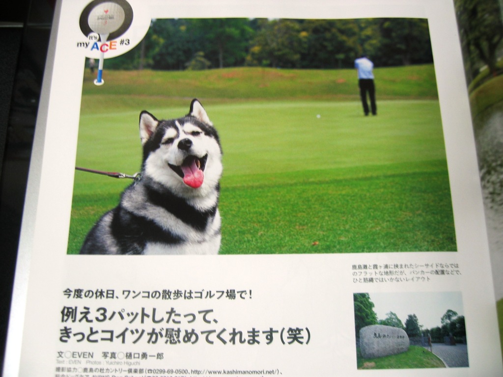 ハスキーのウシと当校訓練士が 枻(えい)出版社発行のゴルフ雑誌「EVEN Vol.2(07年5月30日発売)」の 犬と一緒に行けるゴルフ場の特集(P17)に撮影協力致しました! 撮影の仕事で行ったのですが、芝がすごくキレイで 犬も僕(訓練士)もゴルフコースを満喫してしまいました(笑) すごく気持ち良いゴルフ場でしたよ。オススメです!! ウシも満足そうに笑っております! (←クリックすると拡大写真が見られます)